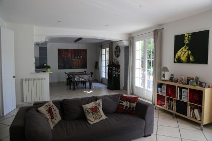 Salon cuisine ouverte 65m2, 1 wc, 1 chambre 9,90 m2, 1 arrière cuisine 16m2, garage 30 m2, 2 parkway, cour arborée devant, terrasse 40 m2 et jardin derrière.