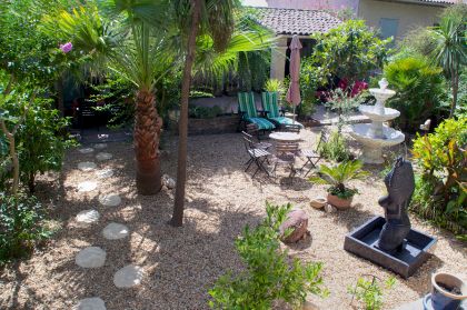 Un jardin clos paysager avec fontaines et barbecue en dur, puits, arrosage automatique.