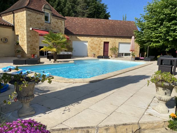 1 maison d'architecte, en pierre tout confort, géothermie, cuisine bien équipée avec îlot central, salle à manger avec cheminée, piscine sur grande terrasse, sur les hauteurs de Sarlat la Canéda, sans aucun vis-à-vis. + 1 maison cuisine 3 chambre entièrement équipée avec pergola bioclimatique sur 6 500 m2 + 2 000 m2 constructibles achetés afin de n'avoir aucun vis-à-vis.