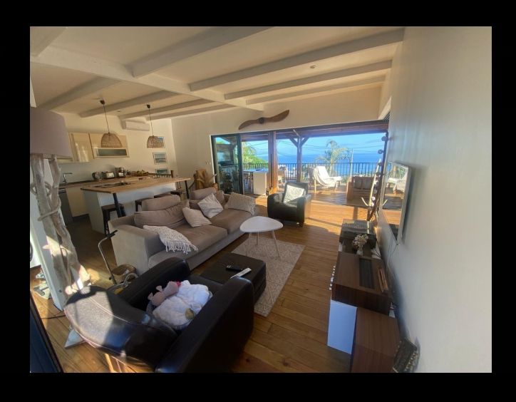 A l'étage, une pièce de vie d'environ 40m2 avec grandes baies vitrées a galandage qui s'ouvrent sur la grande varangue de 50 M2 env avec vue mer et piscine au sel, chauffée. Cuisine extérieure , bbq.