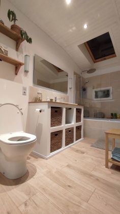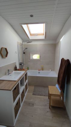- Salle de bain moderne avec baignoire, vasque, WC et puit de lumière au dessus de la baignoire.