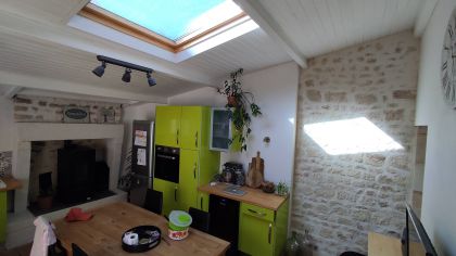 - Cuisine semi-ouverte de 20 m², entièrement équipée avec rangements astucieux (tiroirs à l’anglaise) et poêle à granulés. Un pan de mur en pierre apparentes et un grand Velux motorisé avec volet ajoute luminosité et modernité.