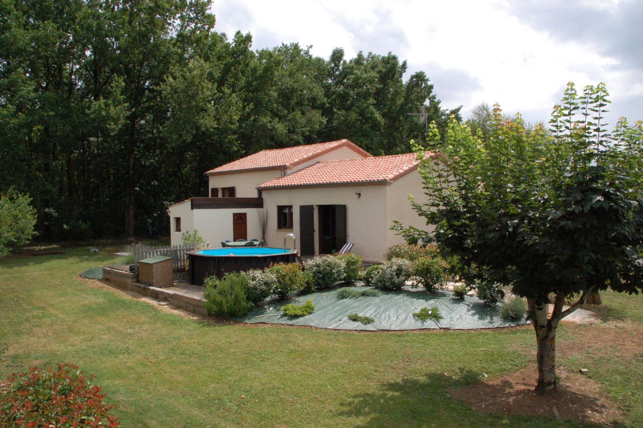 A l’extérieur, 3 terrasses dont une avec piscine bois hors-sol (35m2) et sanitaires (6 m2) une couverte (15 m2) et une ombragée dans le jardin (26 m2).