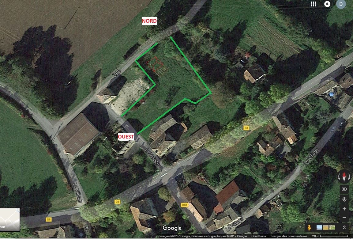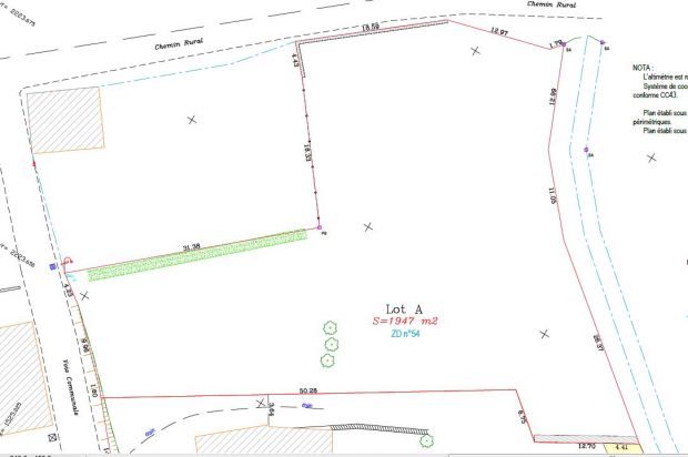 terrain de 1947 m² viabilisé (eau, électricité et téléphone en bordure + fossé communal pour évacuations assainissement individuel)