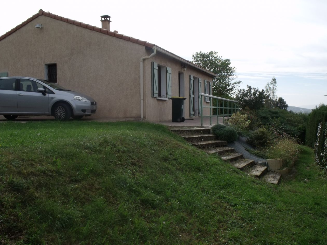 L'extérieur: un garage de 20m²+ mezzanine, entrée, parking, allées, terrasse pavée (100m² environ), pelouse ombragée et talus aménagé d'arbustes et fleurs avec arrosage goutte à goutte.