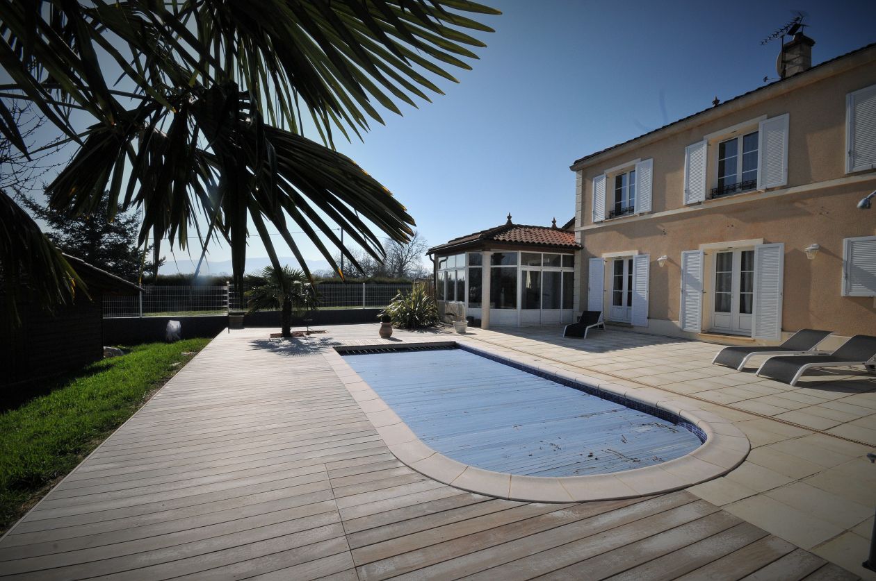 Magnifique maison de style bastide italienne avec de très belles finitions sur un terrain de 1280m2 arboré et clos. Sans vis-à-vis, au calme. Cour pavée avec 8 places de garages dont 4 fermées, isolées et sécurisées, une terrasse de 250 m2 carrelage et bois encadrant une piscine au sel avec électrolyseur bi polarité et volet intégré. 8 pièces ,4 chambres dont une avec mezzanine, deux salles de bains, un open space. Une bibliothèque, un bureau indépendant, une véranda, cuisine américaine, cellier et buanderie. Un très agréable Patio .Alarme, aspiration intégrée, Chauffage électrique sur une très bonne isolation, cheminée bois avec insert. Très belles prestations. Possibilité d’échange définitif avec un appartement/Lyon ou environs complété d’une soulte.