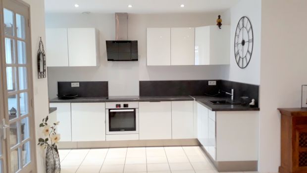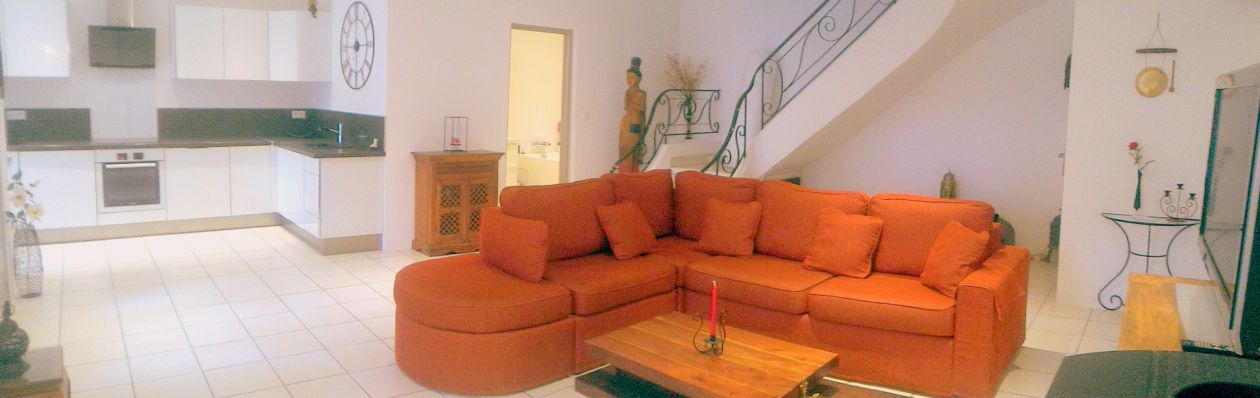Sas d'entrée double portes ouvrant sur une très belle pièce à vivre de 55 m2, avec cuisine contemporaine entièrement équipée. (Electroménager neuf de marque).